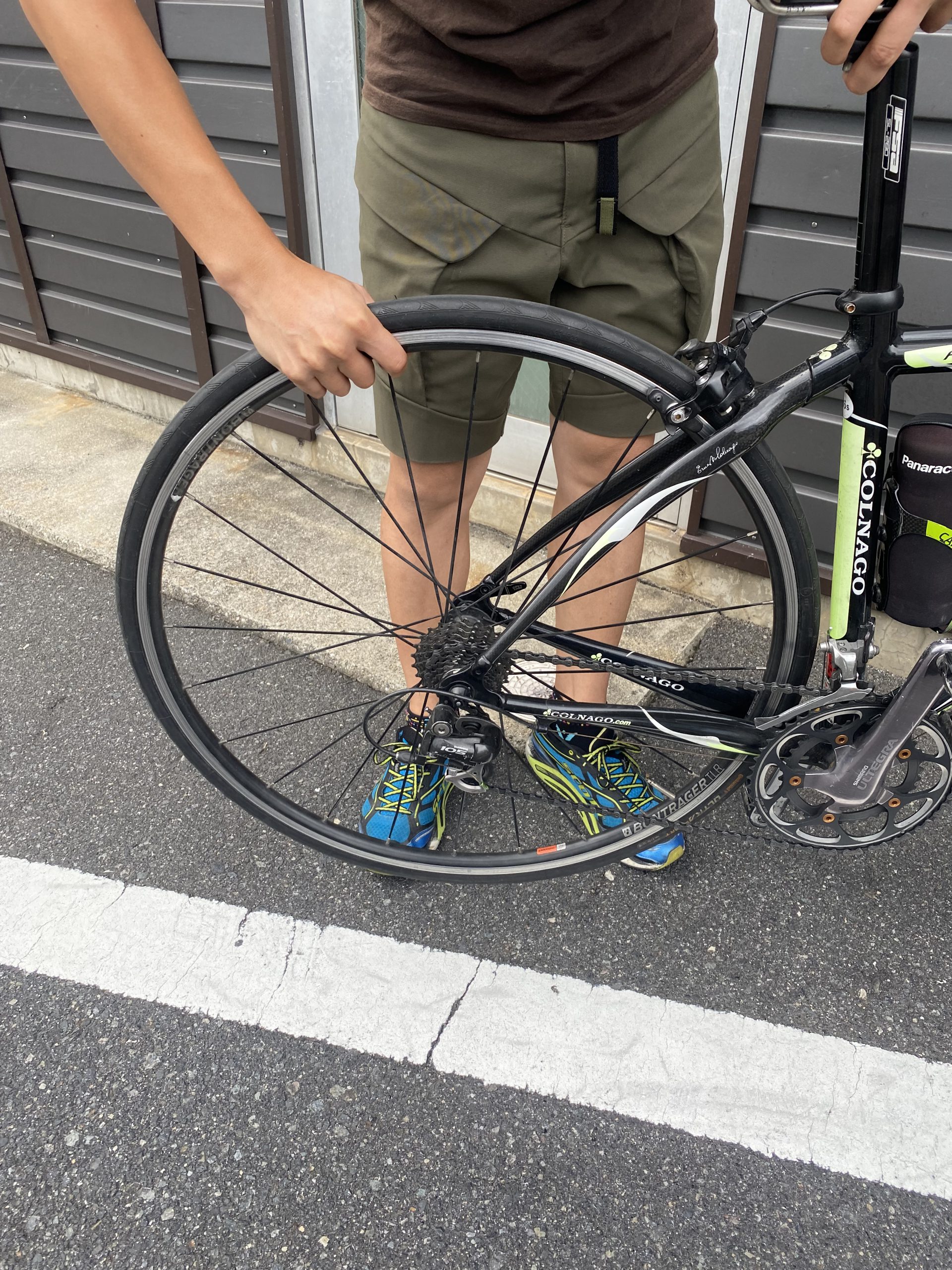 ホイールを回転させブレーキパッドに当たっていないかフレを確認する