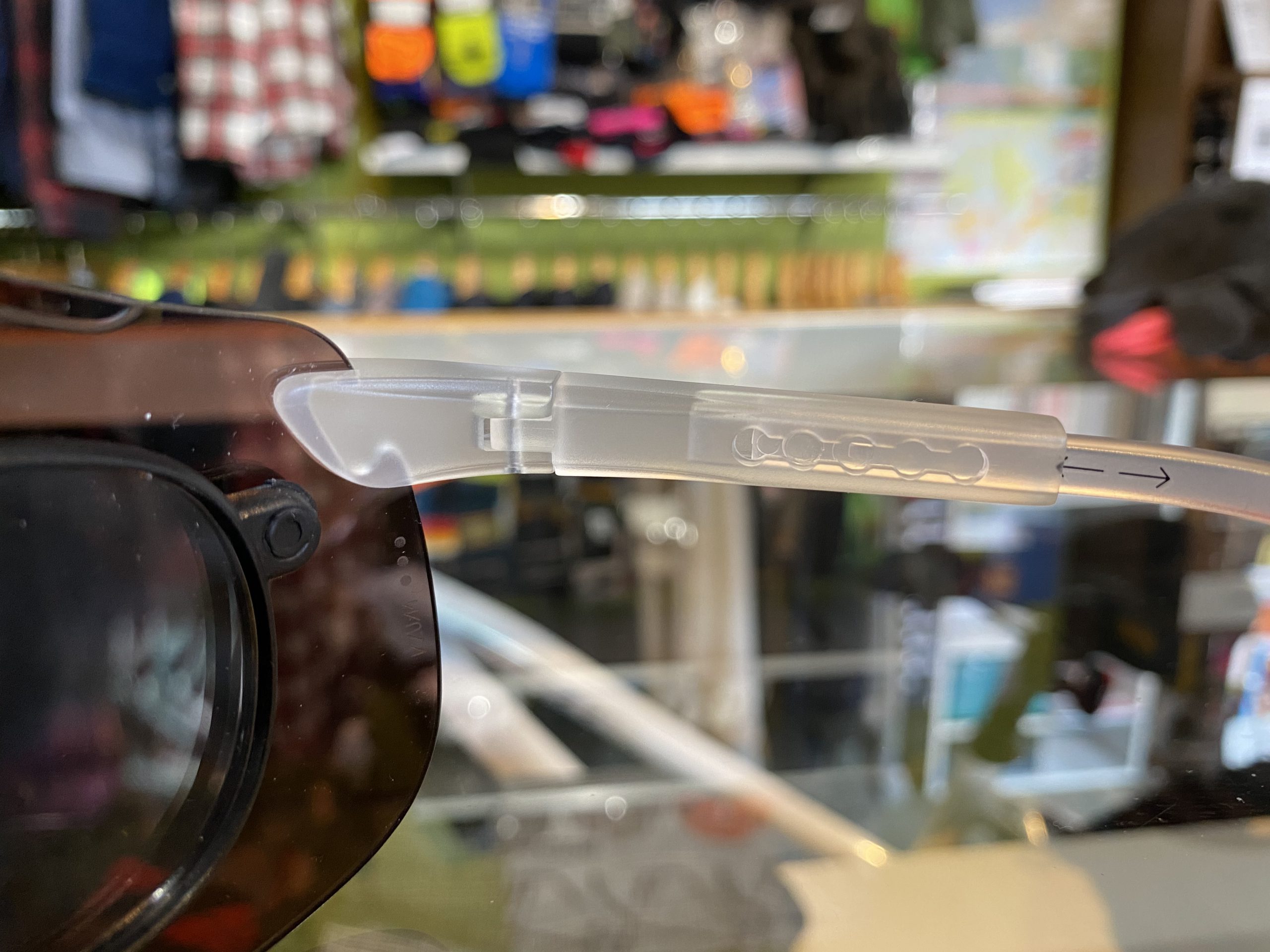 角張ったレンズデザインから耳掛けの部分にかけて、調節機能の代わりにフィット感が高まるように特徴的なカーブを描いています。