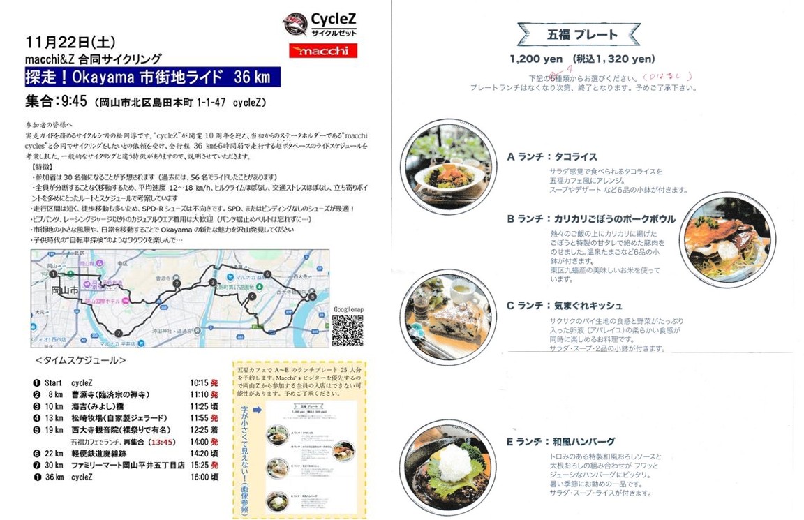 11/22(土)にmacchi cyclesの植田さんが岡山にやってきてライドイベントを開催してくださいます✨
